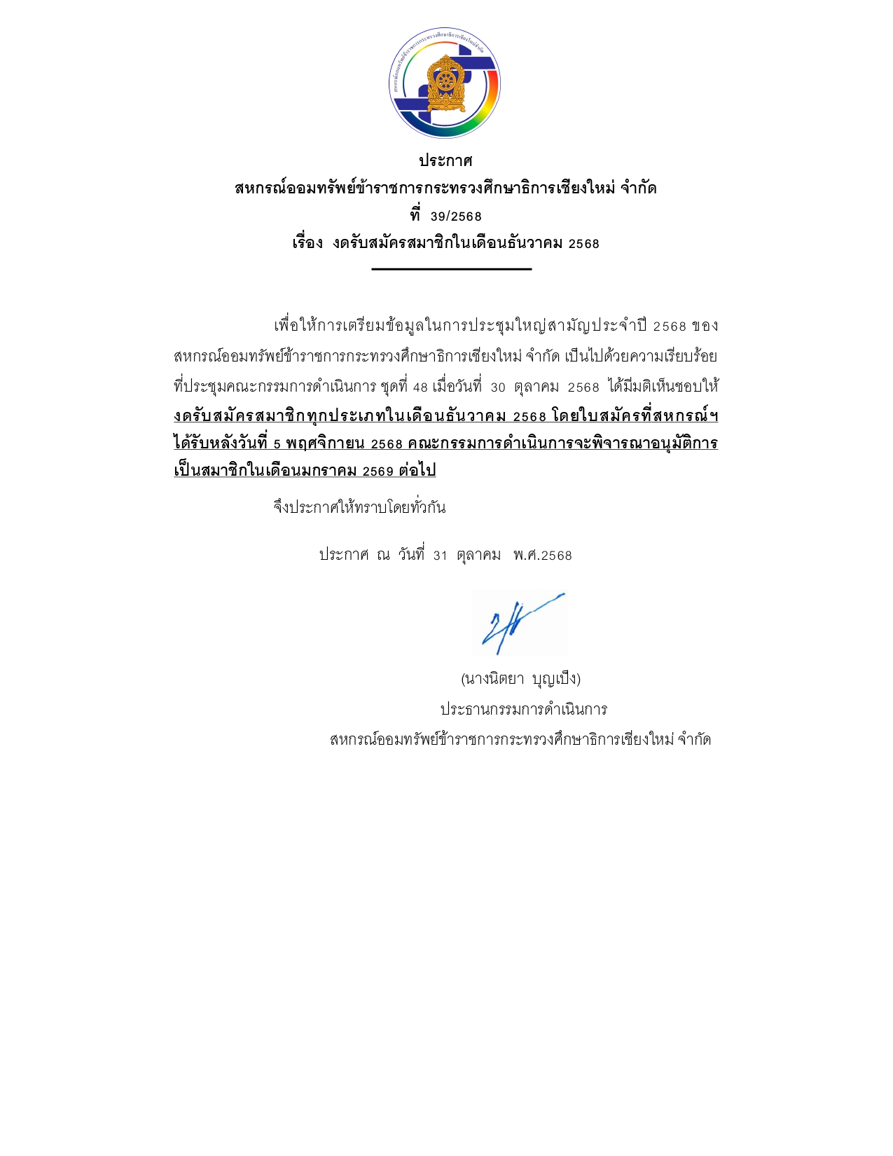 ประกาศ งดรับสมาชิกในเดือนธันวาคม 2568