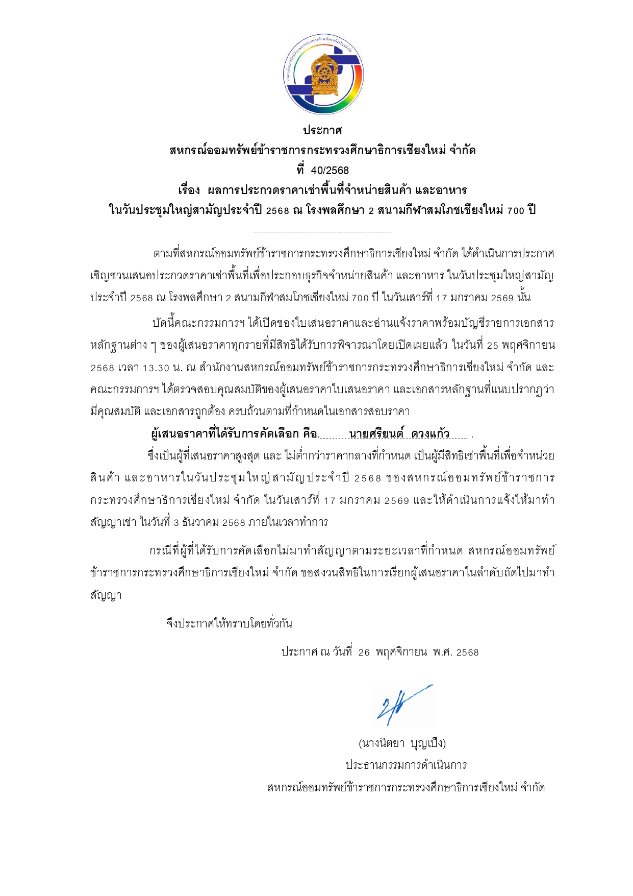 ผลการประกวดราคาเช่าพื้นที่จำหน่ายสินค้า และอาหาร ในวันประชุมใหญ่สามัญประจำปี 2568 ณ โรงพลศึกษา 2 สนามกีฬาสมโภชเชียงใหม่ 700 ปี