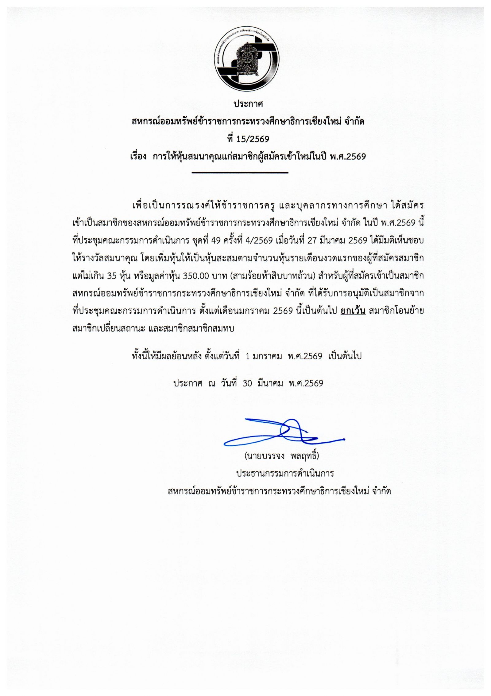 การให้หุ้นสมนาคุณแก่สมาชิกผู้สมัครเข้าใหม่ในปี พ.ศ.2569